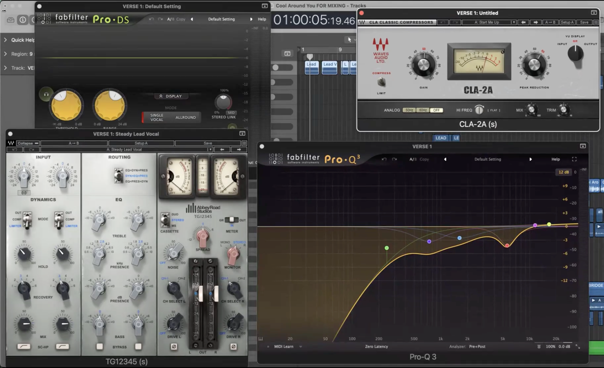 A lot of the Prophet synths are hardware. I have a Moog and a Prophet in my studio. When I was in LA, I was working in my friend Ryan Raines' studio, and I added a few extra things. This has some Valhalla Shimmer, and MicroShift to widen it.